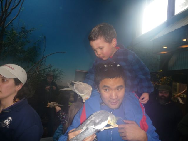 Then we went to the bird house. I've always loved looking at the birds but I'd never wanted to feed them. The birds that day were particularly gregarious. I had one land on my head and another landed on Rachel's head (she didn't like that :-(). I tried to feed them for a while but then I got scared, maybe next time I can feed them the whole seed stick.