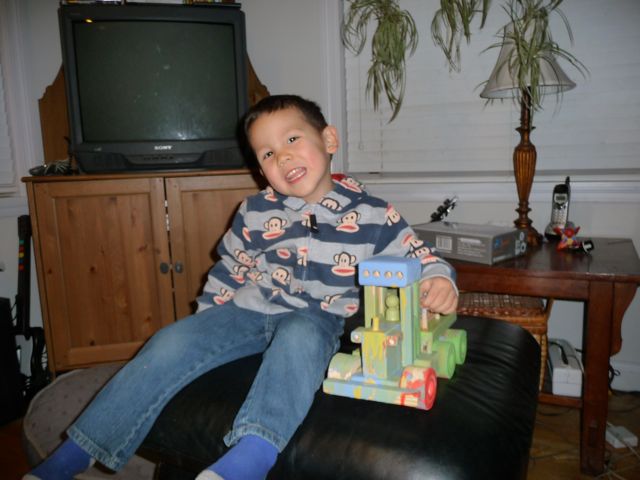I really liked having everybody over to visit, it was fun to have all my great aunts and uncles and my cousin to play with plus I got some pretty neat gifts (check out me with a truck I got to paint).