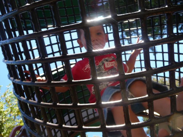 It's been another busy week. I took a ride on an Airplane to visit mommy and daddy's friends in California and their baby boy Julian. I was a really good boy on the airplane ride and colored my books. I'm even trying to stay inside the lines. Everybody was pretty tired when we got there so we took it easy and just went to the park. I found lots of things to climb on including this weird thing.
