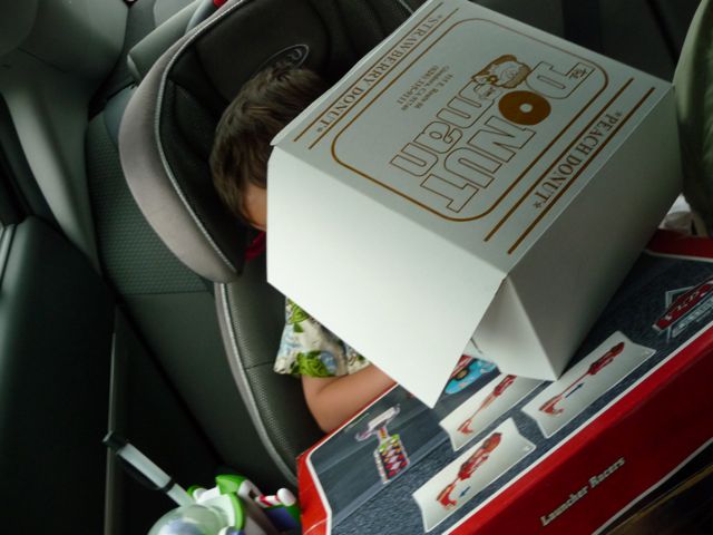 Before we get to Disneyland, I'll tell you a story. Mommy and daddy took me to where they went to college while we were on vacation and I had a fun time walking and playing around. But the best part was when we left and got some Strawberry Donuts from this place called Far Fosters. I ate half of a donut that was the size of my head. Then I fell asleep on the donut box on the way home.
