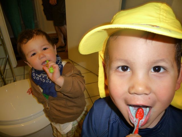 Aunt Wedge, uncle Robin, and my friend Julian also came to play with us a couple of days. Julian really liked the ocean but I wasn't so sure. We both liked to get good and dirty though. Julian and I took a bath together afterwards and almost clogged up the drain with all the sand that came off us. Here's us finishing our cleaning by brushing our teeth.