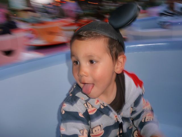 After dinner, daddy took me to another ride called It's a Small World. I got really annoyed that it was so long and loud and asked daddy when it was ging to be over :-) We stayed for a pretty cool parade afterwards though and I danced with mommy in the street. Mommy decided that I should go on the teacups for our last ride of the day and boy did it make everyone dizzy, I had a lot of fun though.